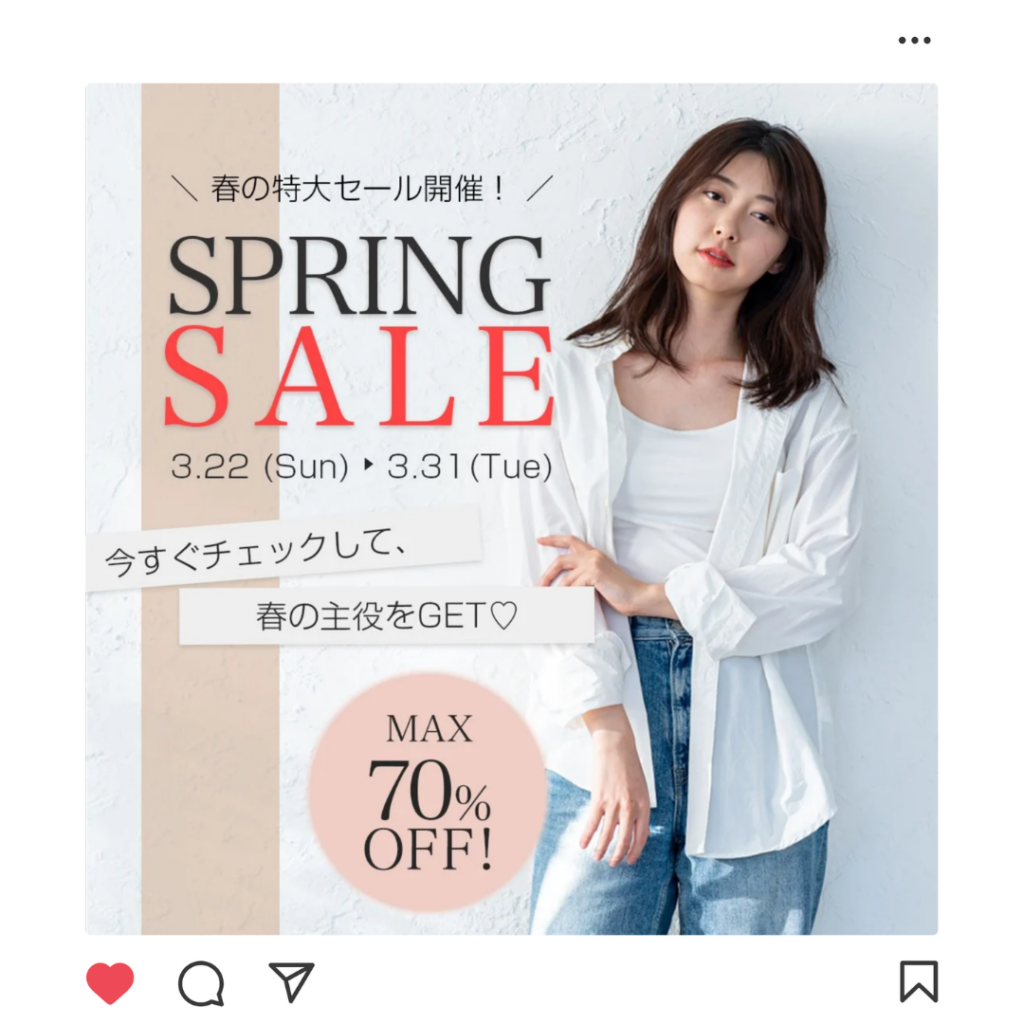 | アパレルECサイトの 春セール告知 | Instagram広告 (1080×1080) | Photoshop | 写真AC | 1.5時間 |