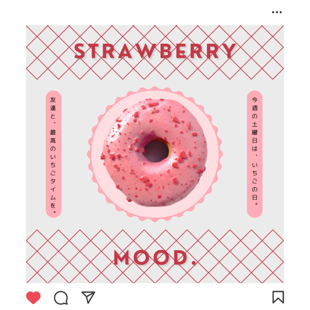 英語はビジュアルの一部として、一瞬で「いちごの季節のイベント感」を伝達。日本語はサブタイトルとして、 縦書きや小さなサイズで配置し、じっくり読ませることで「映え」だけでなく、確実な行動へ導くことを目的としています。